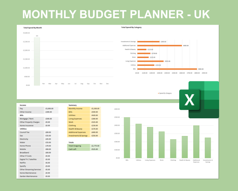 Simple Monthly Budget Spreadsheet UK Edition, Easy To Use Excel Workbook